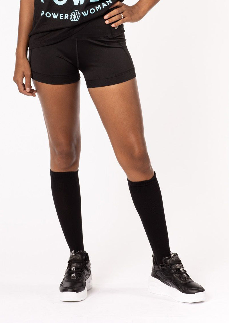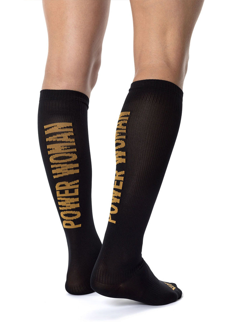Knee High Compression Sock, designed to bring you extra power during your endurance sports activities. This black sock features the Power Woman logo on the front, near the toe area, showcasing your dedication to excellence. The Power Woman name is boldly displayed on the calf, while the inspiring message "The sky is not the limit" is positioned at the arch of the foot.